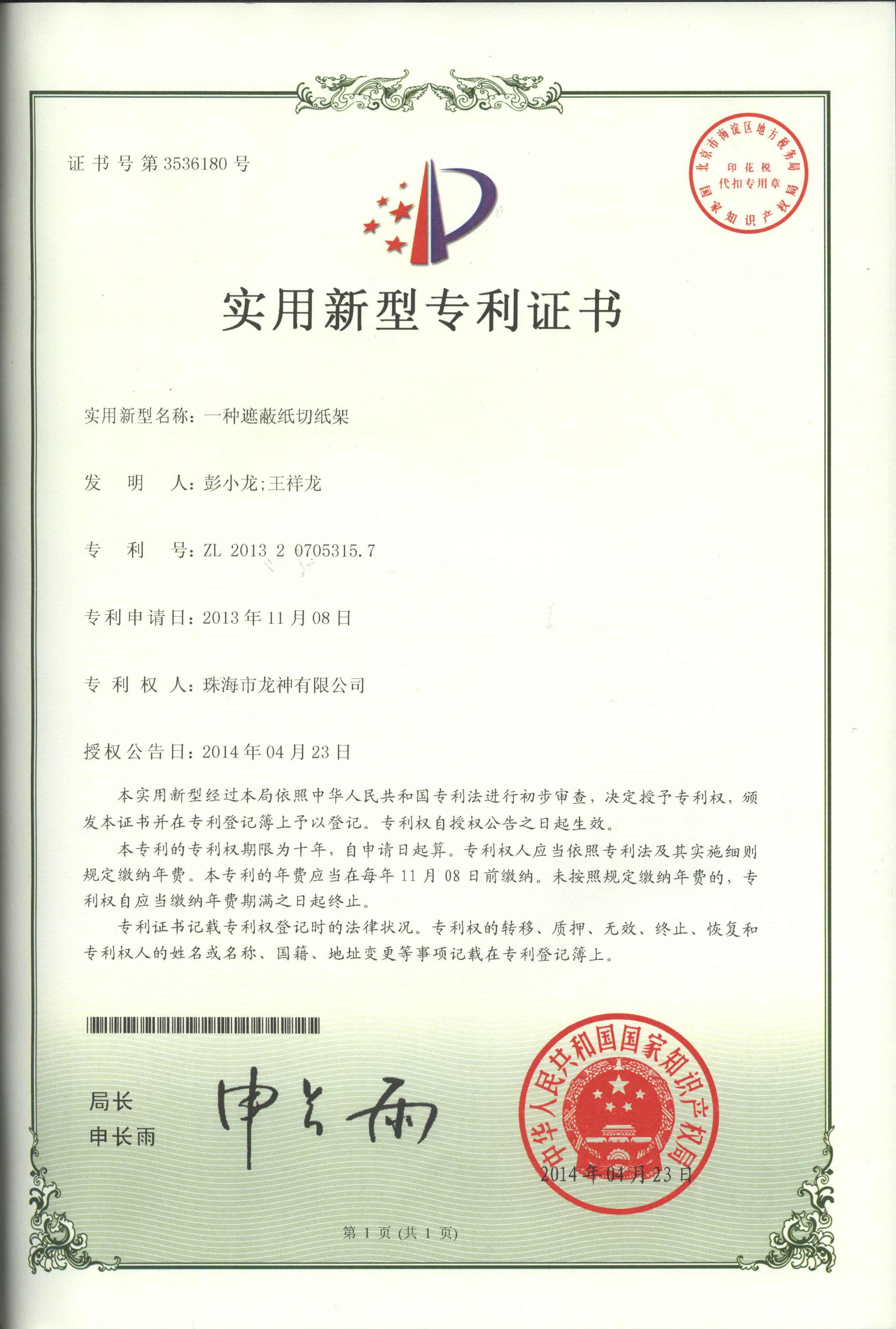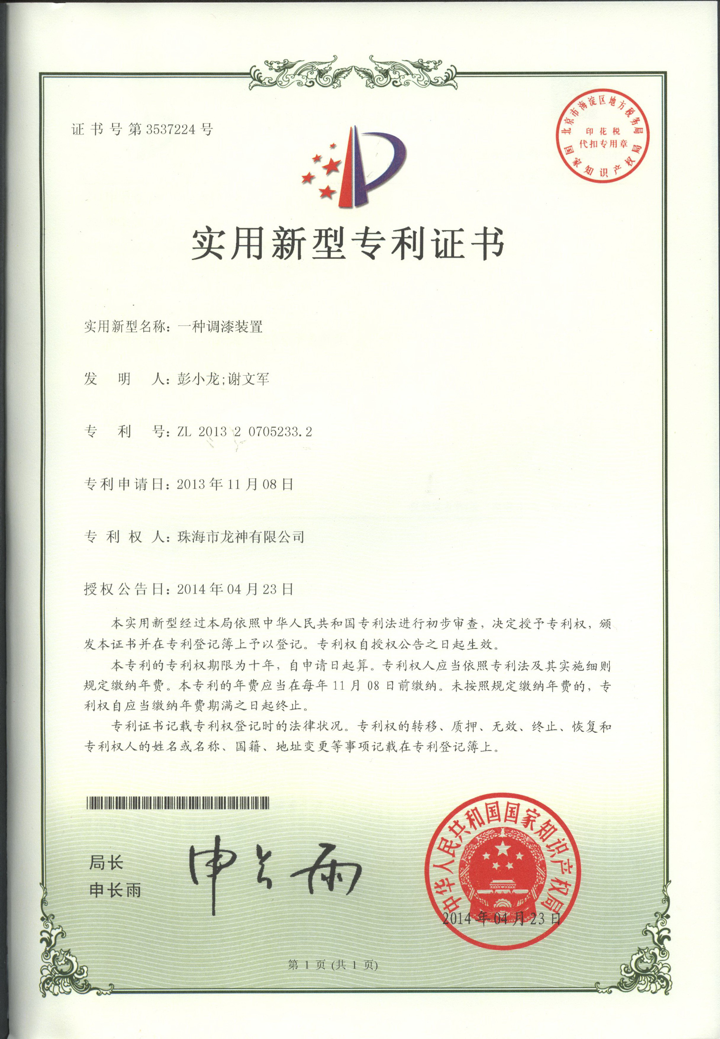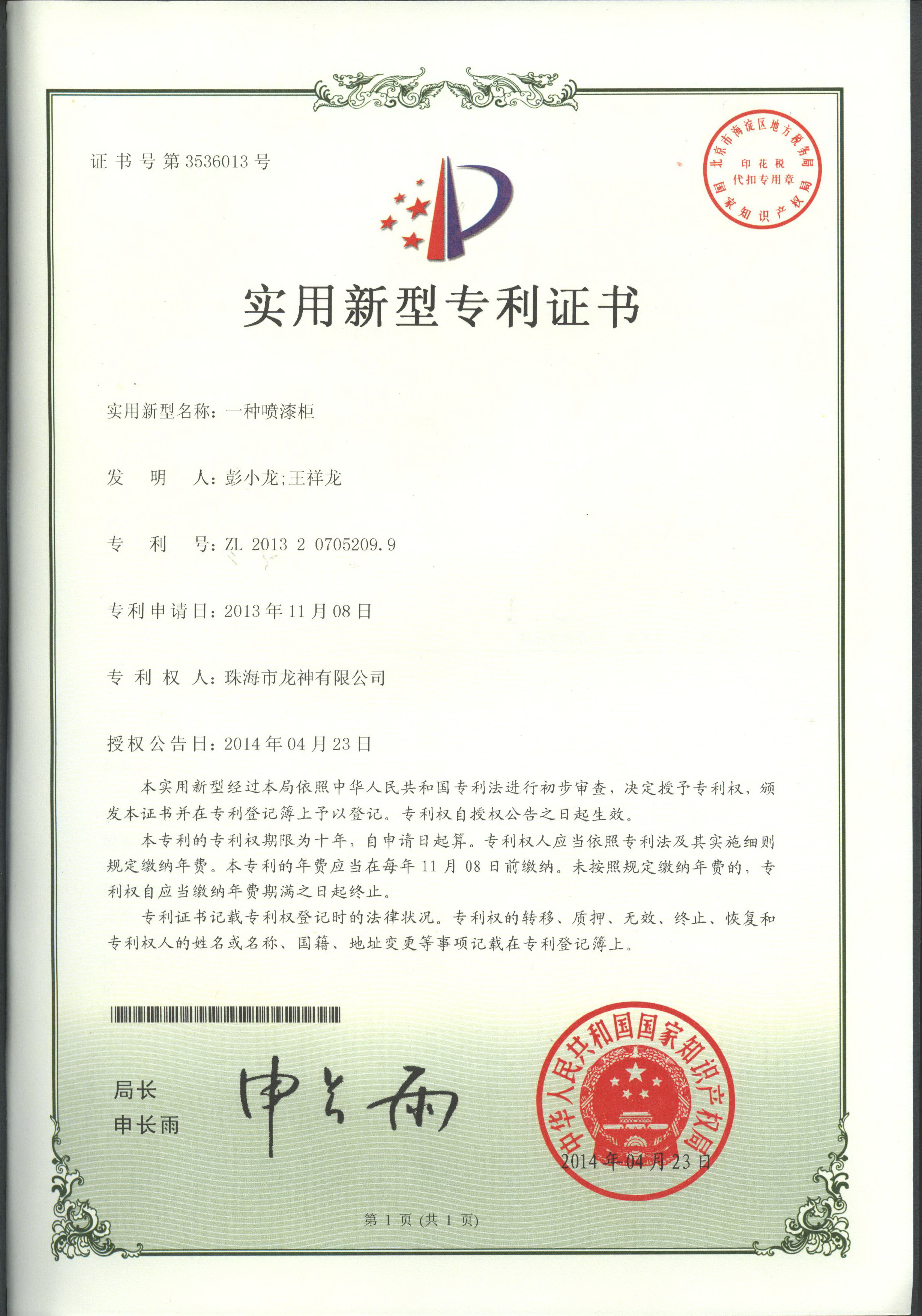 企業(yè)榮譽 調漆裝置專利證書 噴漆柜專利證書遮蔽紙切紙架專利證書 塊型拉拔鉤專利證書 噴槍清洗機專利證書無靜電干燥加熱器專利證書 壓縮空氣空壓機房供應系統(tǒng)專利證書除油劑導料器專利證書多功能噴槍清洗機 環(huán)保自吸塵打磨系統(tǒng) 切膜裝置汽車保險杠修復專用電烙鐵 精確可調整形架專利證書 移動式無塵干磨專利證書 管道快速連接件專利證書 彭小龍總經(jīng)理證書 2012-11-27 30148